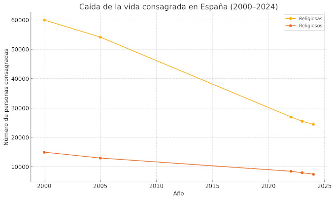 En el año 2005, las religiosas sumaban 54.160. Sin embargo, para 2023 la cifra había caído hasta las 25.531. Los religiosos varones, que eran alrededor de 15.000 a comienzos de siglo, se han reducido a poco menos de 8.000. Esta disminución afecta a todas las ramas y carismas, y se ha visto acompañada por un envejecimiento generalizado de las comunidades y una drástica caída en las vocaciones.