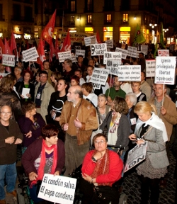(Efe/InfoCatólica) 2.500 personas, según la Guardia Urbana, se manifestaron ayer jueves en la Plaza Sant Jaume de Barcelona contra la visita del Papa Benedicto XVI bajo el lema «En defensa del laicismo», en una concentración organizada por la plataforma "Yo no te espero". Por su parte, centenares de personas convocadas por la asamblea «Eu non te espero» expresaron por su parte su rechazo por la tarde en la Alameda compostelana a la visita del Papa el sábado a la capital gallega, una protesta que concluyó con un altercado entre unos 50 concentrados y la Policía.