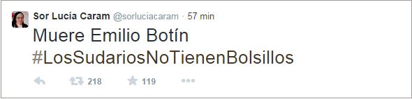Emilio Botín, presidente del Banco Santander, el más importante de la zona euro, ha fallecido a los 79 años de un ataque al corazón. Nada más darse a conocer la noticia en la redes sociales, Sor Lucía Caram ha escrito varios mensajes en su cuenta de Twitter arremetiendo contra el fallecido.