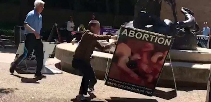 (LifeSiteNews/InfoCatólica) Como una muestra de la «tolerancia» y «capacidad para debatir ideas» de los defensores del aborto, un estudiante de la universidad de Texas entró en furia y comenzó a golpear, patear y arrancar varios avisos y pendones pro-vida colocados por un activista en una plaza central del campus universitario.