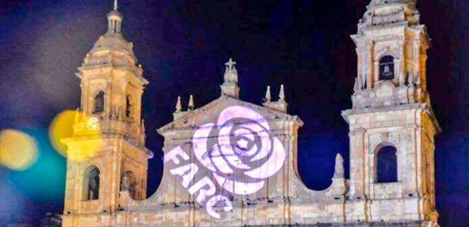 Para su nuevo logo, las FARC utilizaron dos símbolos tradicionales del comunismo: La estrella de cinco puntas y la rosa roja. Al llegar la noche, poderosos reflectores proyectaron el logo sobre las fachadas de los edificios de la Plaza de Bolívar, incluyendo la Catedral Primada. Sobre la profanación, el presidente del Tribunal Eclesiástico de Bogotá, Mons. Pedro Mercado, expresó su «repudio total» a través de su cuenta de Twitter.