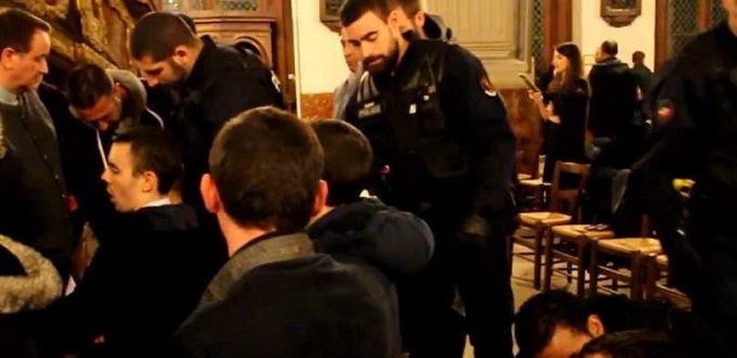 Un video que captura una breve porción del incidente muestra a los jóvenes arrodillados y cantando mientras policías armados se reúnen para sacarlos de la iglesia.