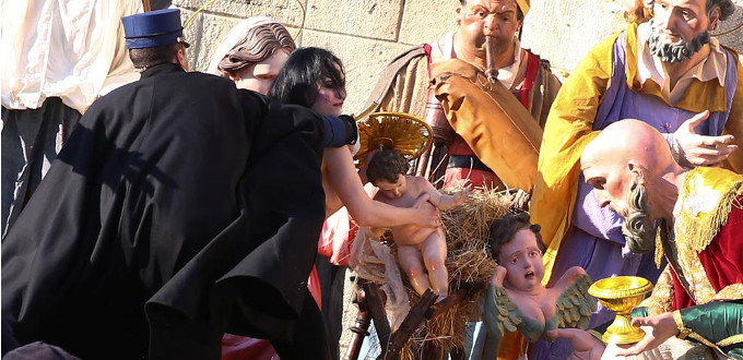 (Agencias/InfoCatólica) Según explica un fotógrafo de Reuters, la mujer saltó por encima de las vallas de seguridad y se apresuró a coger la estatua del pesebre, mientras gritaba «Dios es mujer», mismo eslogan que tenía pintado en su espalda.
