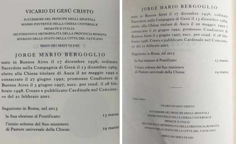 Este año se ha modificado ese formato acostumbrado y, en el nuevo Anuario, la página dedicada al Papa comienza por su nombre: Jorge Mario Bergoglio. Al nombre, sigue la reseña biográfica. Solo después, tras una raya horizontal y en letra de menor tamaño, se incluye un apartado denominado: «Títulos históricos». Es en este apartado donde aparece la lista que anteriormente se encontraba al principio, encabezada por el título de «Vicario de Jesucristo».