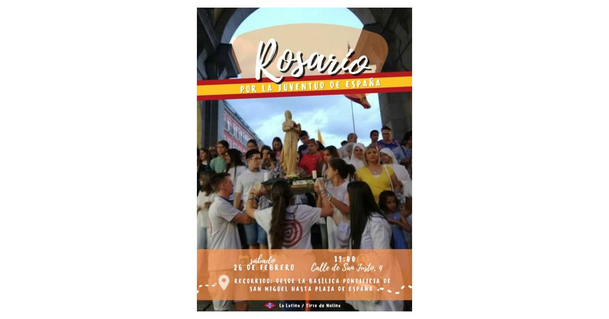 (InfoCatólica) Por segundo año, Rosario por la Juventud de España ha convocado a jóvenes para rezar el Rosario en Madrid, el sábado 26 de febrero a las 19:00h. Desde la Basílica Pontificia de San Miguel hasta Plaza de España se rezará por la juventud del país.