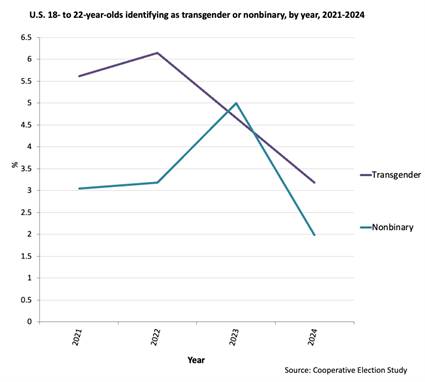 Los datos que ha dado a conocer el sociólogo Eric Kauffman, profesor de política en Birkbeck College, parecen indicar una clara tendencia en Estados Unidos: quienes se identifican como trans o no binarios en estados Unidos están disminuyendo de forma abrupta. Esta caída se refleja en tres encuestas diferentes realizadas entre alumnos universitarios.