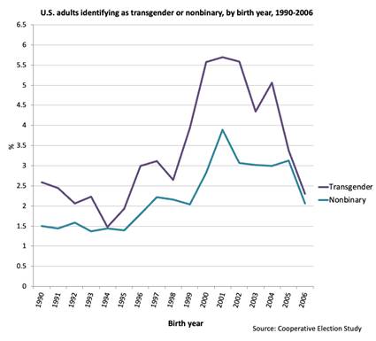 En definitiva, el dato preciso puede tener un margen de error, algo por otra parte propio de este tipo de encuestas, pero la tendencia descendente es indiscutible. Los más propensos a identificarse como trans son los nacidos a mediados de la década de 2000. Los nacidos antes o después se identifican como trans en mucha menor proporción.