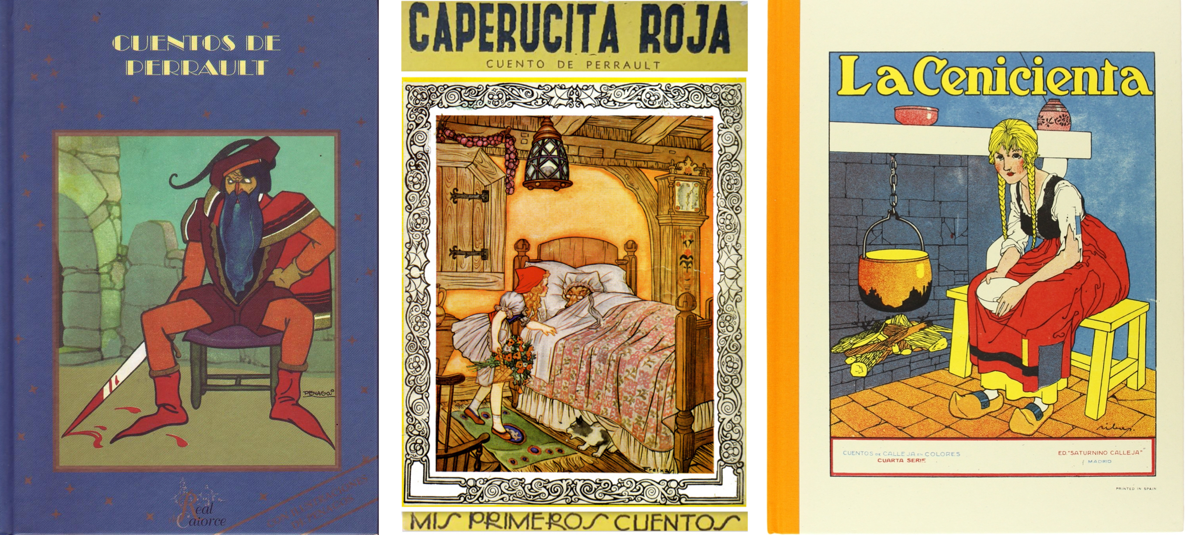 Portadas de algunas ediciones en español de los cuentos de Perrault. |