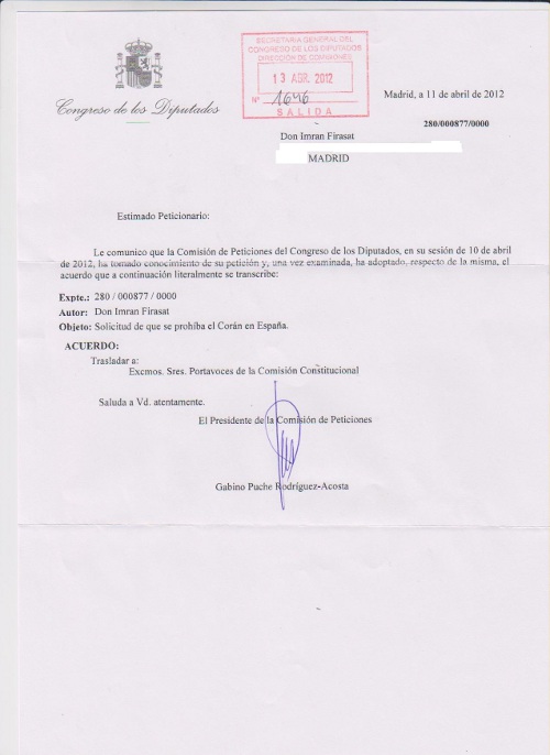 Recientemente, Imran ha logrado el primer paso de su propósito, pedir prohibir el Corán en España. Según informa la Gaceta, la Comisión Constitucional del Congreso ha admitido el estudio de esta petición. El documento, firmado por el presidente de la Comisión de Peticiones, Gabino Puche Rodríguez-Acosta. El texto está sellado el pasado 13 de abril.