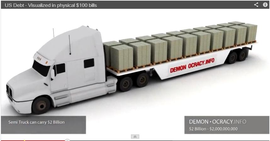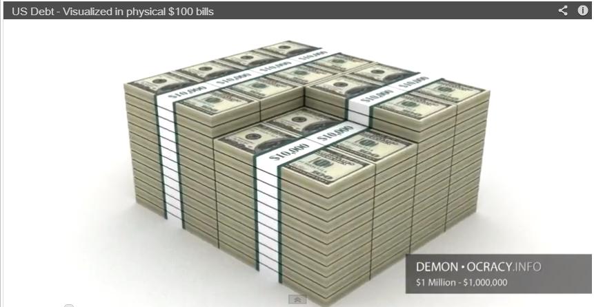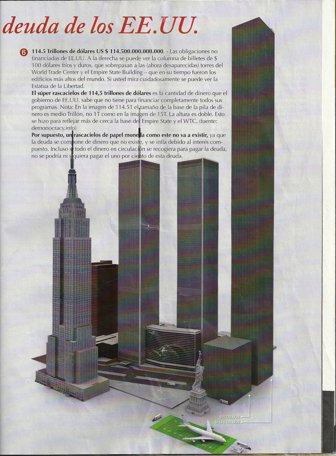 Por supuesto, un rascacielos como este no puede existir, ya que la deuda se compone de dinero (en billetes) que no existen, y se infla debido al interés compuesto. Incluso si todo el dinero en efectivo que está circulando se recogiera para pagar la deuda, no se podría ni siquiera pagar el uno por ciento de esta deuda.
