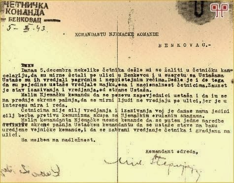 Traduzco la frase clave del documento: "Los chetniks no tienen por finalidad ofender ni provocar, sino hoy tenemos por única finalidad la lucha contra del comunismo junto a las fuerzas armadas alemanas."