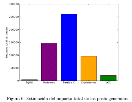Se puede observar que comunidades más pequeñas como Pardido X o Ciudadanos son más activos que otra más grande, EQUO en concreto. Pero, ¿esta actuación tiene efecto fuera de los seguidores de estas páginas? ¿Captan el interés de otros usuarios? Para tal fin es necesario construir otra herramienta de análisis.